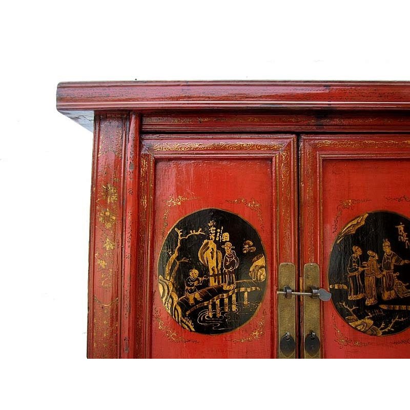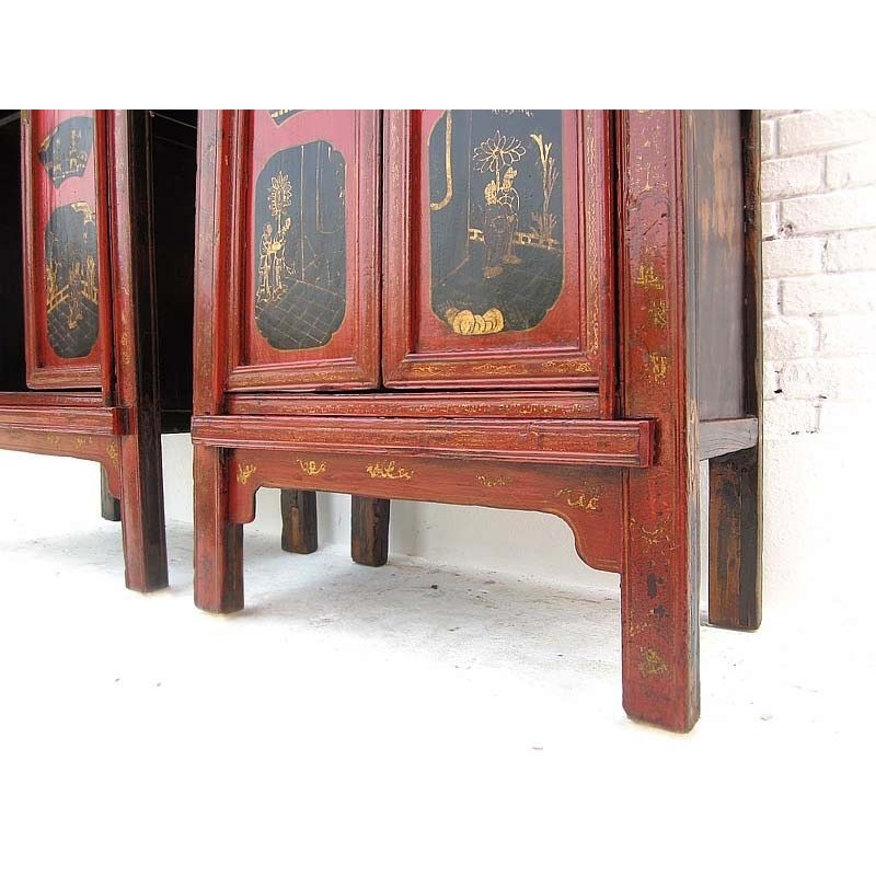 These cabinets are painted with smooth red lacquer and golden painting on the front part. There are one of the typical Shanxi furniture during Qing dynasty and come from the famous city of Pingyao.
