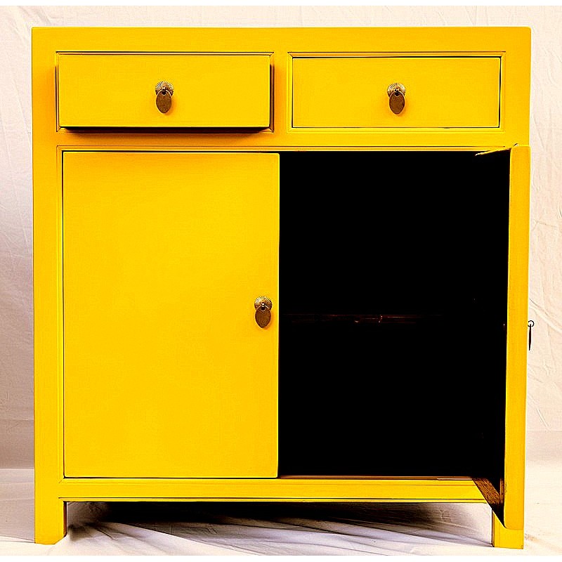 Petit meuble rouge peu profond - deux portes, deux tiroirs. Jaune tonique inspiré des années soixante.